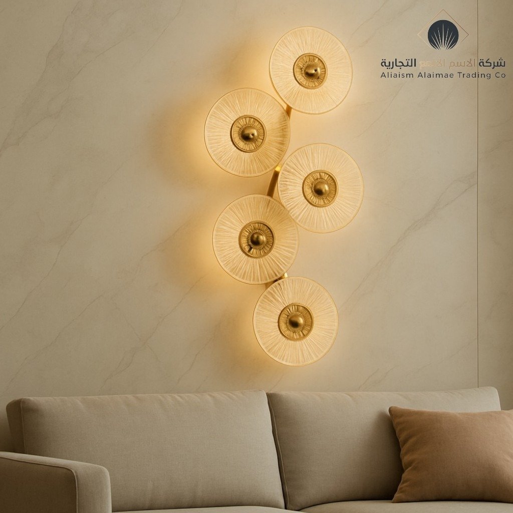 إضاءة جدارية فاخرة بتصميم عصري مميز، مكونة من خمس وحدات دائرية بترتيب انسيابي أنيق، تجمع بين الألوان الثلاثة: