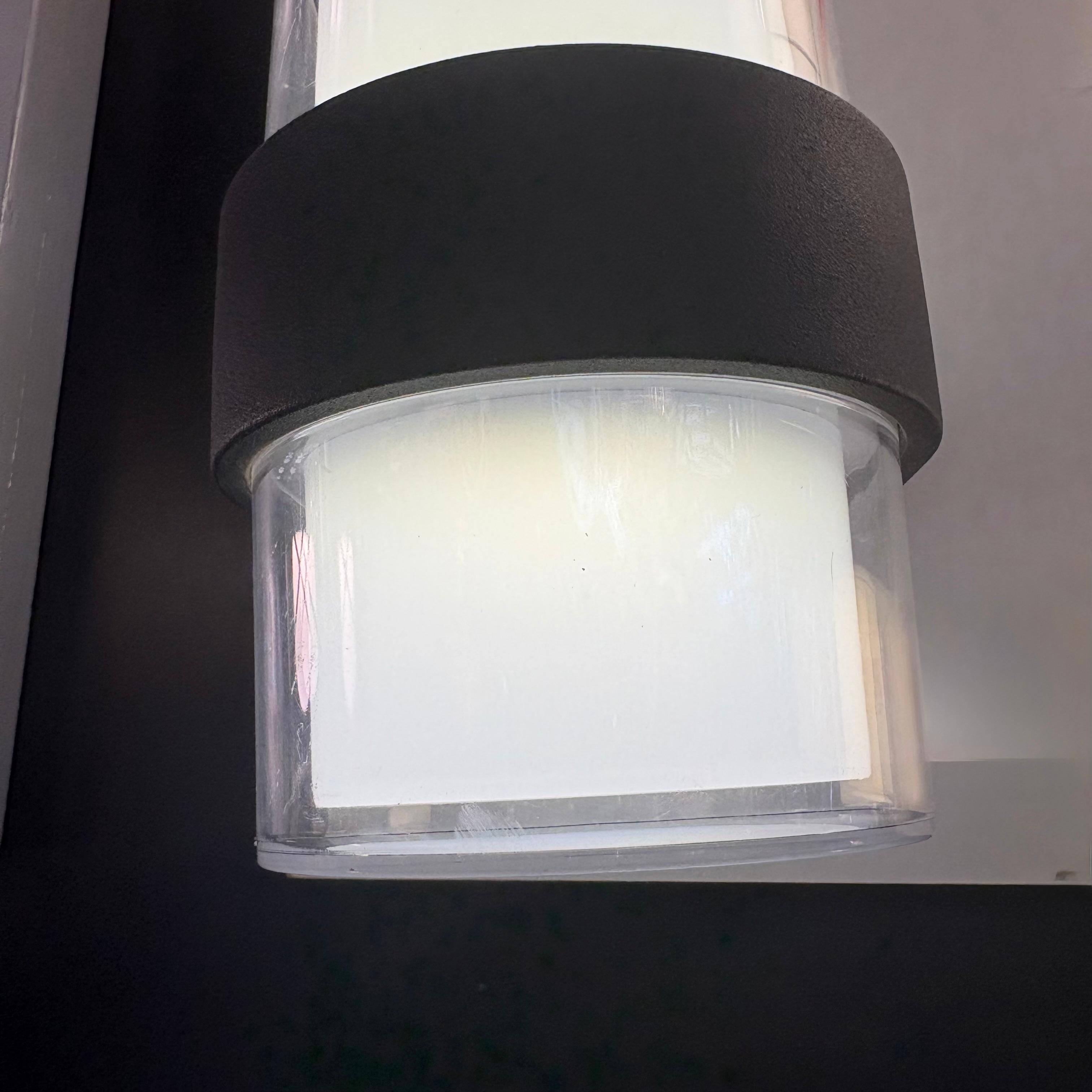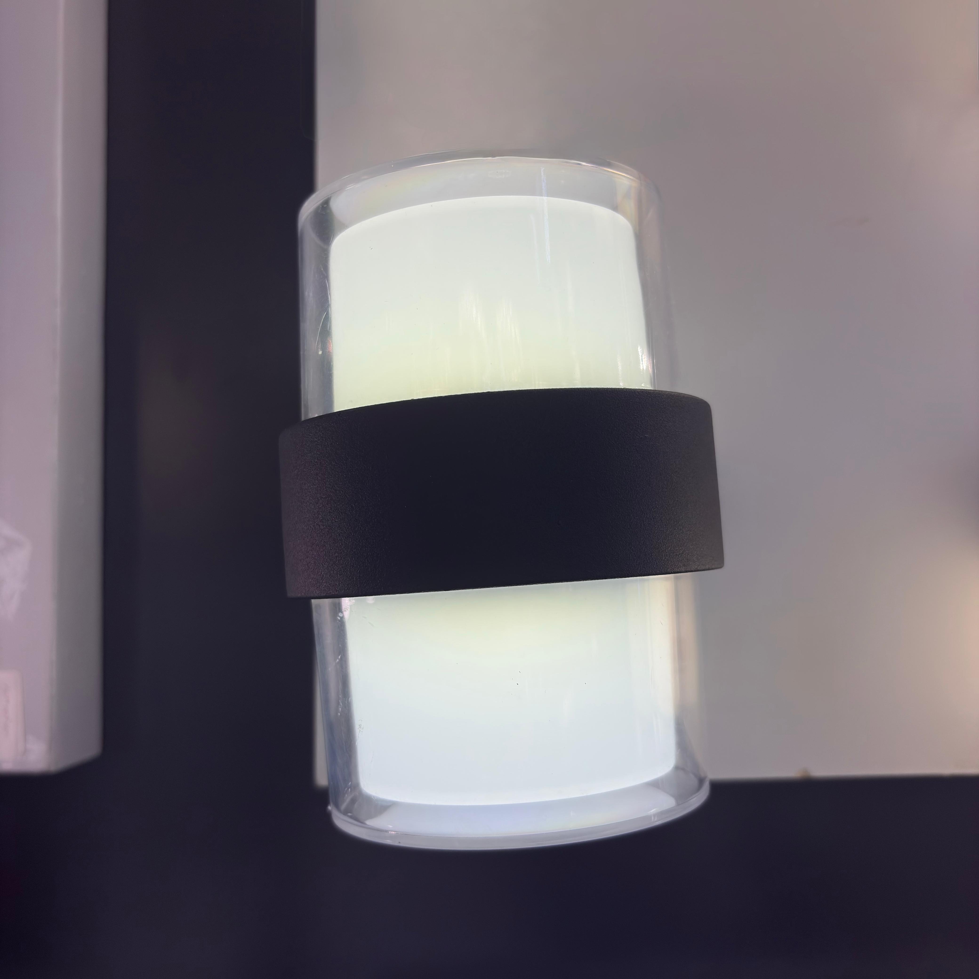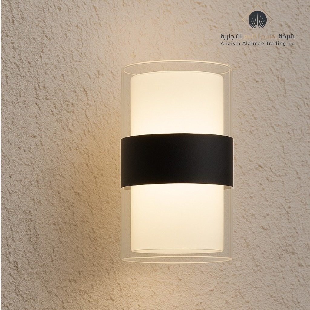 كشاف جداري حديث بتصميم اسطواني وزجاج مزدوج يعطي إضاءة ناعمة وموزعة، مثالي للواجهات الحديثة.