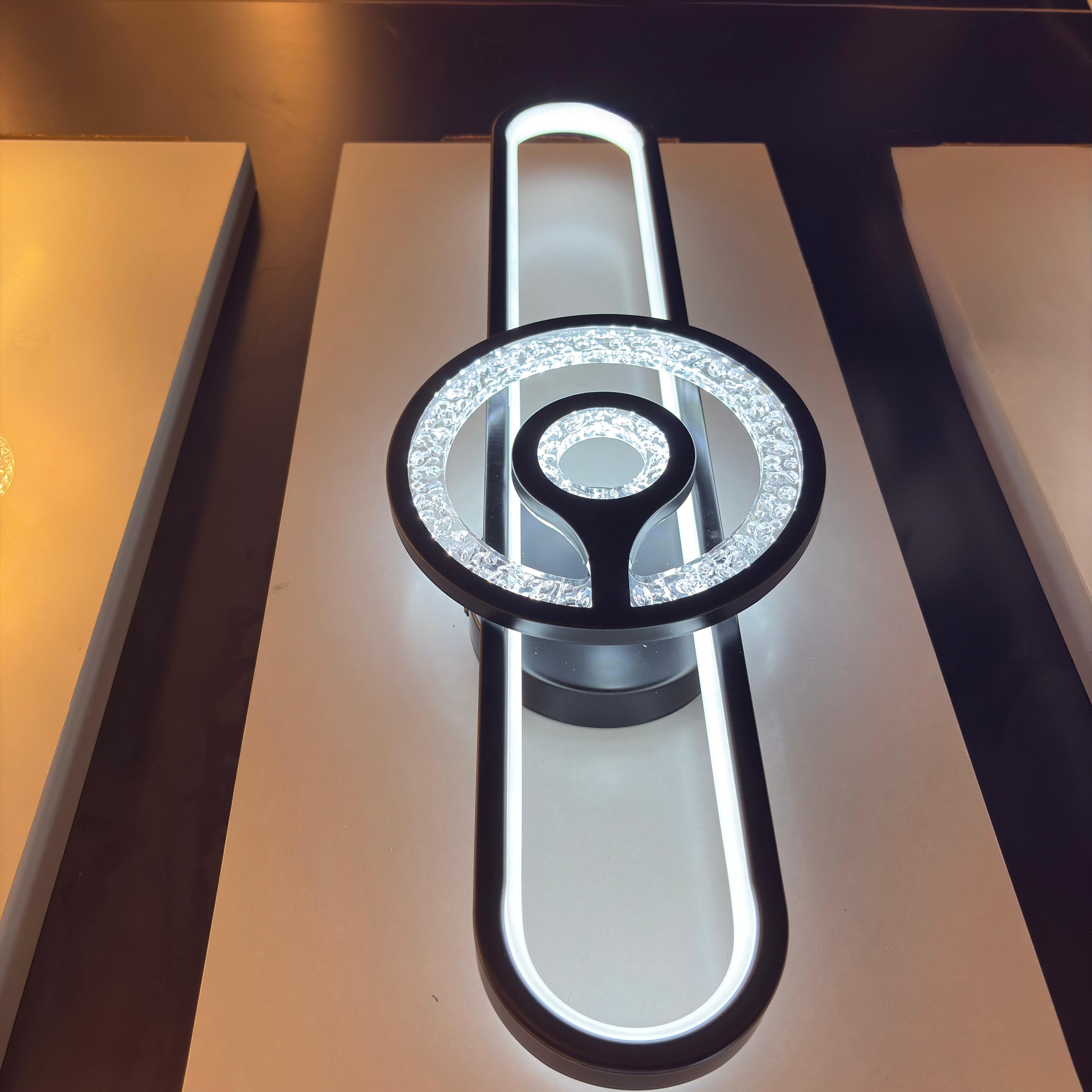 إضاءة جدارية عصرية بطابع هندسي أنيق، تأتي بتصميم طولي مدمج مع دائرة مضيئة في الوسط، لتمنح الجدار لمسة فنية مبتكرة.